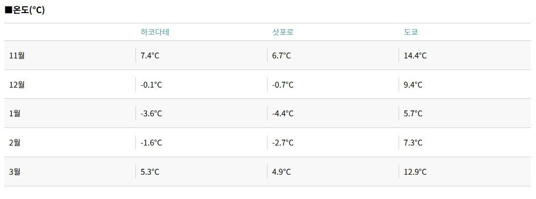 🌡 평균 기온 6°C (11월~3월 기준) → 삿포로보다 따뜻해 여행하기 딱 좋은 계절