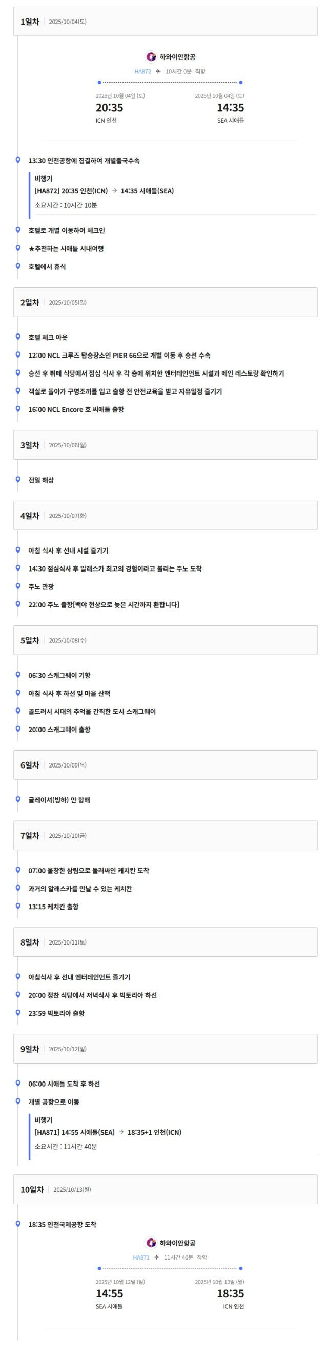 ✔️ 해당 상품은 항공&크루즈 실시간 특가 적용되는 상품으로 예약상황에 따라 요금이 변동될 수 있으니 빠른 예약 추천드립니다.